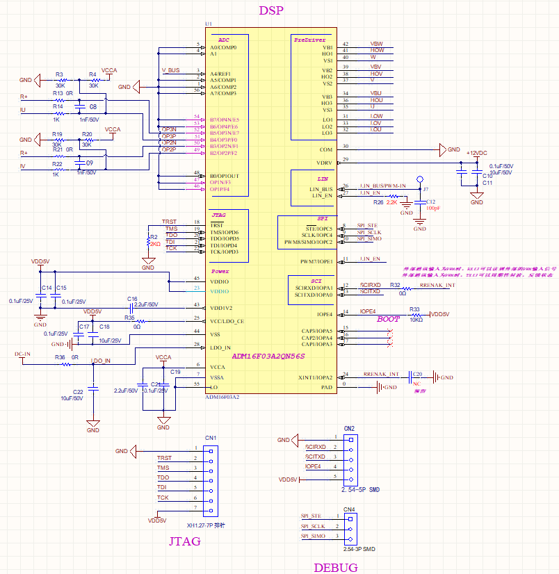 ADM16F03A2最小系統(tǒng)如下圖所示,包含JTAG接口、SPI通信接口、串口、PWM模塊、ADC模塊等。系統(tǒng)自帶的運放PGA可以通過外圍電阻配置為差分模式用于相線電流采樣。當需要用到SPI調(diào)試時,可以通過SPI接口,借助進芯SPI通訊調(diào)試工具進行SPI通信調(diào)試;當需要離線燒錄程序時,通過3V3、TX、RX、GND信號測試焊盤,借助進芯的離線燒錄工具可實現(xiàn)快速的脫機燒錄。