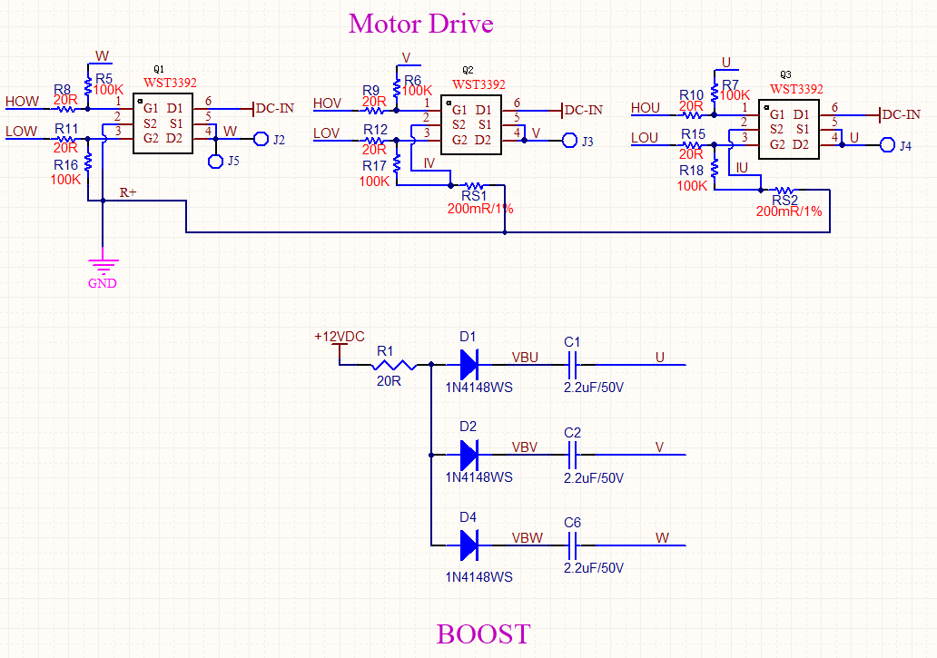 H橋電路采用上下管均為NMOS的配置,總計6個NMOS組成三相H半橋驅(qū)動電路。