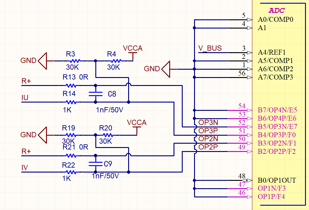 ADC采樣電路包括兩路橋臂相電流的采樣和母線電壓采樣。相線電流用于堵轉(zhuǎn)位置檢測 后續(xù)還可用于電流環(huán) 母線電壓檢測除用于保護外 還為軟件算法的計算提供電壓參數(shù)