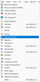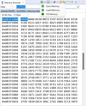 6.打開 View->Memory Browser。在Memory Browser窗口,可選擇Data\Program\IO\Peripheral內(nèi)存類型以及開始地址;可操作 Save Memory將內(nèi)存數(shù)據(jù)保存到文件,Load Memory和Fill Memory加載數(shù)據(jù)到內(nèi)存。