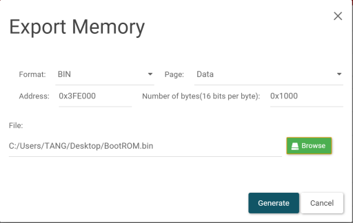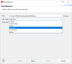 3.通過Export按鈕,彈出內(nèi)存數(shù)據(jù)保存功能,選擇Bin或者COFF文件格式,即可保存數(shù)據(jù)到文件。