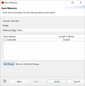 7.選擇Save Memory,在彈出的對(duì)話框中,選擇需要保存數(shù)據(jù)的文件格式;然后通過Add Range設(shè)置需保存內(nèi)存的起始地址和長度。